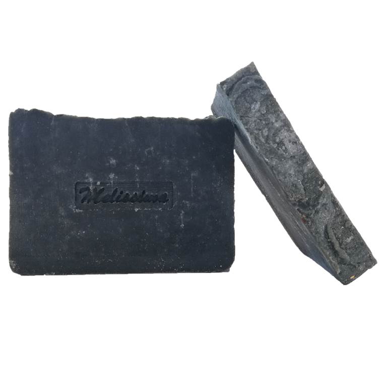 Jabón Melissima hecho mediante proceso en frío para maximizar sus propiedades con aceites naturales (oliva, coco, karité, cacao, ricino), agua destilada y desmineralizada, hidróxido de sodio al 99% de pureza apto para jabones, carbón vegetal activado y aroma a manzanilla.